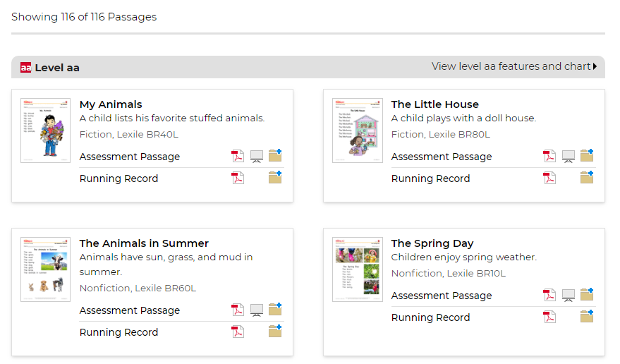 对应美国GK级别,也就是学龄前。多以图片为主,从aa阶段的只有几个单词逐渐过渡到C级的简单句子。句式也非常简单,都是不断重复的,便于磨耳朵。